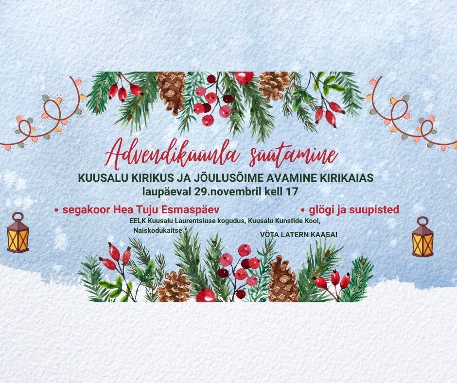 1.advendi eel, laupäeval 29.novembril kell 17 süütame kirikus advendiküünlad. Sõna ütleb õp. Peeter Paenurm, laulab segakoor Hea Tuju Esmaspäev. Seejärel avame õues Kuusalu Kunstide Kooli õpetajate ja õpilaste valmistatud jõulusõime ning Naiskodukaitse pakub glögi ja suupisteid. Juhatame jõuluootuse sisse!